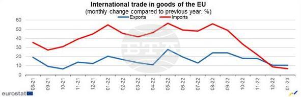 През януари 2023 г. износът от еврозоната към държави извън ЕС възлиза на 222,9 милиарда евро, или ръст от 11,0 на сто на годишна основа, сочат първите предварителни данни на Евростат. Вносът достига до 253,5 милиарда евро, или ръст от 9,7 на сто спрямо януари 2022 г. В резултат дефицитът в търговията със стоки на еврозоната със страните извън ЕС достига до 30,6 милиарда евро през януари 2023 г., спрямо 30,2 милиарда евро година по-рано.