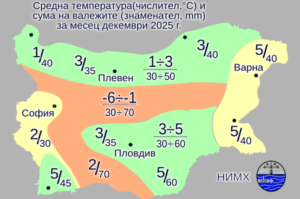 Тази година през декември се очаква средната месечна температура да бъде около и над нормата, която в Северна България и по високите полета е от 0 до 2 градуса, в Горнотракийската низина – 2-3 градуса, по Черноморието и в най-южните райони – 4-6 градуса, а в планините – от минус 8 до минус 2 градуса.