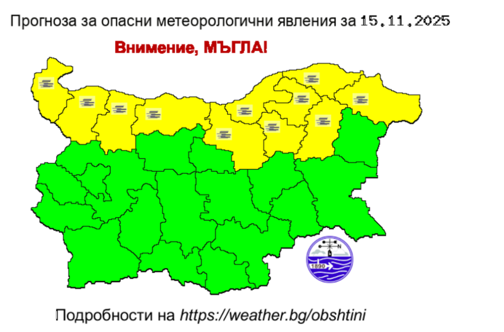 Националния институт по метеорология и хидрология към БАН обяви жълт код за мъгла в 11 области в Северна България.
